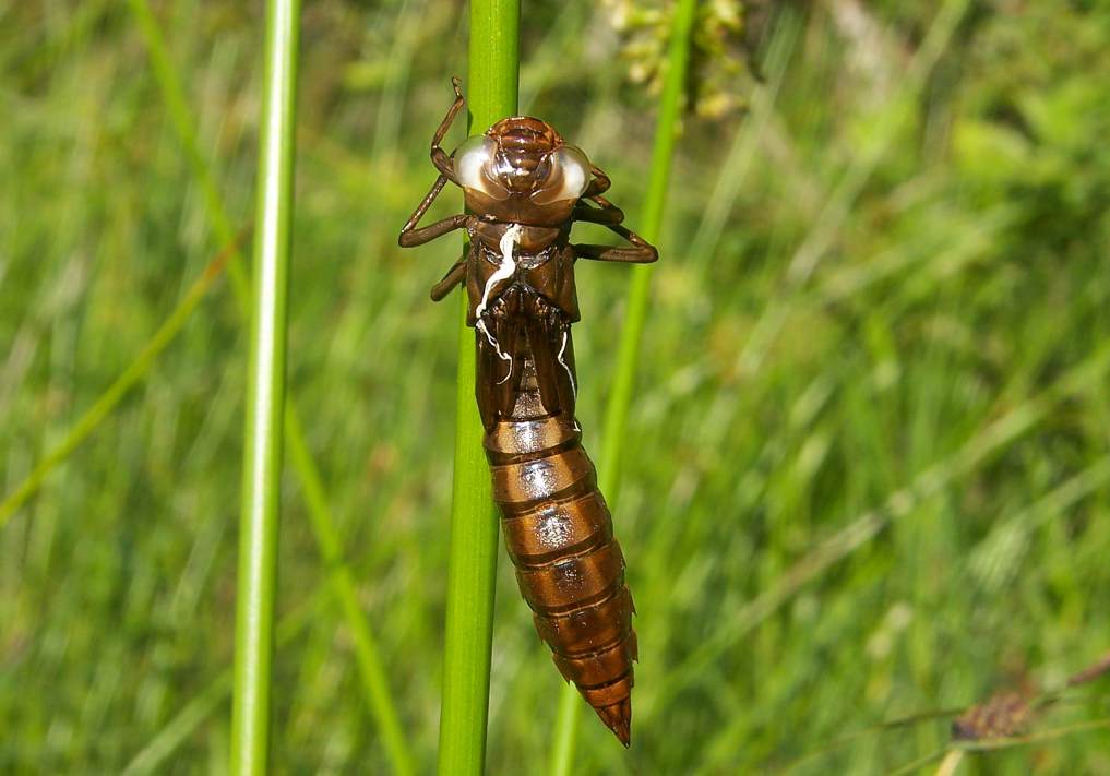 U Aeshna subarctica stosunek cerci do paraproktów wynosi 0,6:1 — sporadycznie 0,7:1 (patrz piramida analna w: Budowa ważki). U A. subarctica długość przedniego uda jest znacznie mniejsza i wydaje się ono grubsze, niż u bardzo podobnej larwy (i bardzo podobnej ważki) A. juncea — co można porównać kliknąwszy w ten link. (foto Piotr Mikołajczuk) Kliknij w zdjęcie aby powiększyć. |