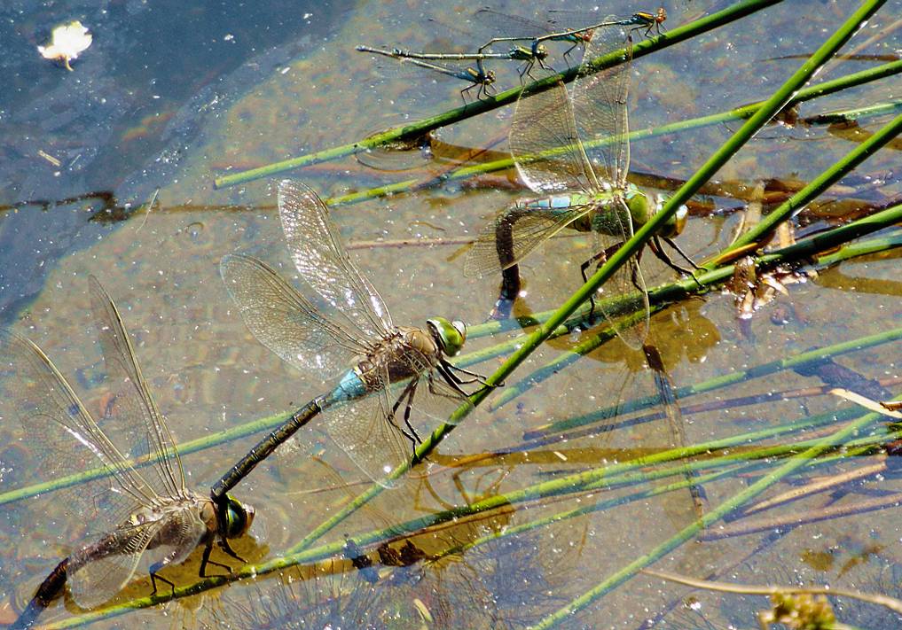 Bardzo ciekawe zdjęcie — typowy sposób składania jaj — obok siebie Anax parthenope w tandemie, Anax imperator w pojedynkę, a w dodatku dwa tandemy Erythromma viridulum na górze zdjęcia.